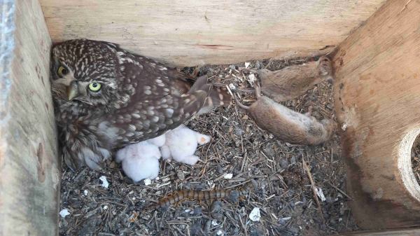 Mochuelo con pollos en una caja nido con despensa de topillos