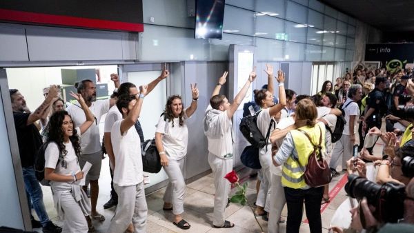 Los recién llegados, todos ellos participantes en la llamada Flotilla a Gaza, salieron de la terminal vestidos de blanco, con los brazos en alto y sonriendo ante la emoción del reencuentro. Algunos corearon lemas en favor del pueblo palestino, como “¡Palestina vencerá!”, en una muestra de apoyo a la población civil de la Franja de Gaza, que continúa bajo bloqueo.