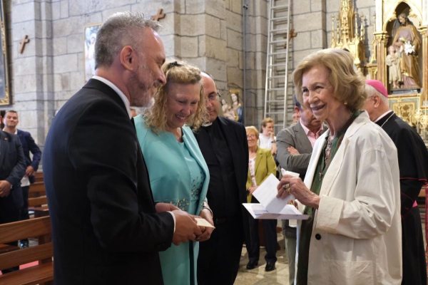 La jornada finalizó con un recorrido de la Reina Doña Sofía por el casco histórico de la villa y su visita al Santuario de los Remedios, dedicado a la primera Virgen coronada en lengua gallega, que representa un profundo vínculo espiritual y cultural para la comunidad local.