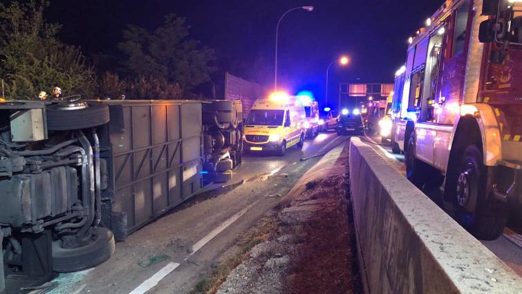 Veinte personas han resultado heridas de diversa consideración al volcar un autobús de línea interurbana en la salida 14 de la A-1 (carretera de Burgos), en el término municipal de Alcobendas (Madrid).