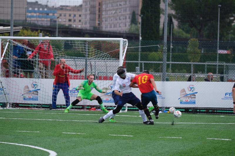 En un partido de gran intensidad, bajo la lluvia que caía sobre el terreno de juego del Centro di Preparazione Paralimpica de Roma (Italia), España salió de inicio con Pedro Gutiérrez bajo palos; Pablo Cantero, Iván López, Youssef El Haddaoui y Sergio Alamar.