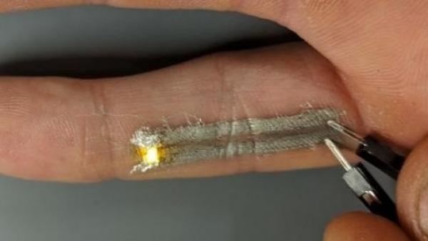 En un vídeo del proyecto, Nick Williams, estudiante graduado, imprime dos pistas electrónicamente activas a lo largo de la parte inferior de su dedo meñique. Al final de su dedo conecta los cables a una pequeña luz LED, aplica un voltaje en la parte inferior de los dos cables impresos.