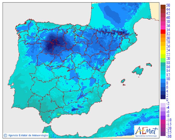 Durante esta jornada, añade Hervella, “se produce un descenso generalizado de las mínimas”, que en el centro estarán en torno a 4 o 5 grados por debajo de las habituales para la época del año.